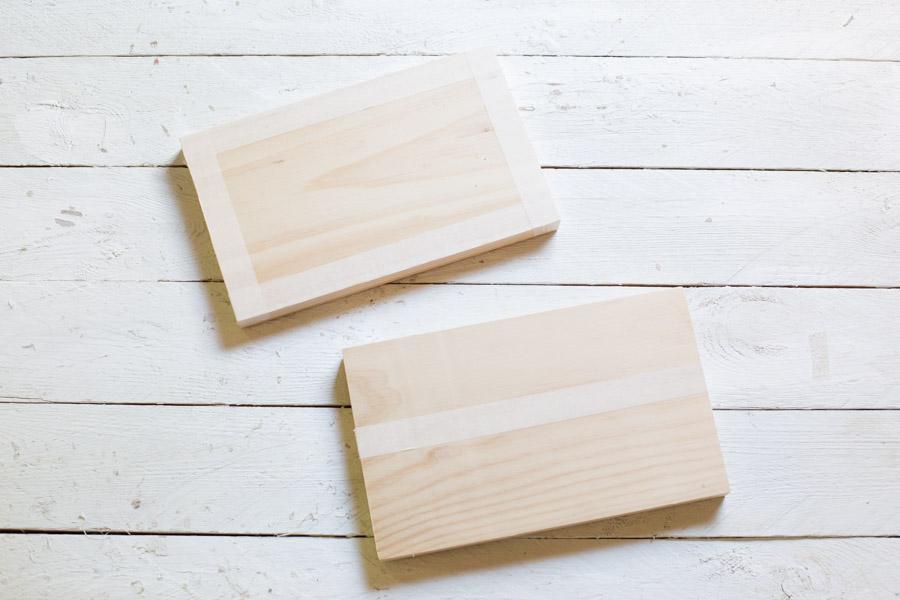 Si utilizas unas tablas como yo, sierra el mango de la tabla. Con las bisagras une las dos tablas. Con cinta de carrocero, hacemos una marca para saber donde pintar.