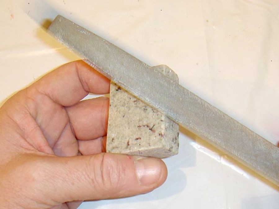 Esta pieza de granito, que sobró al montar el copete de la cocina, hará un bonito contraste con la madera, y dará ?cuerpo? al pisapapeles. La repasamos con la lima de metales.