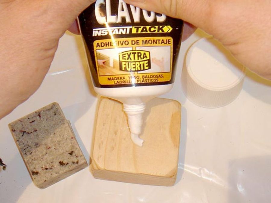 Llega el momento del primer adhesivo. Y dado que una de las dos superficies es porosa, podemos utilizar un adhesivo de montaje. Lo aplicamos conforme a las instrucciones del envase.