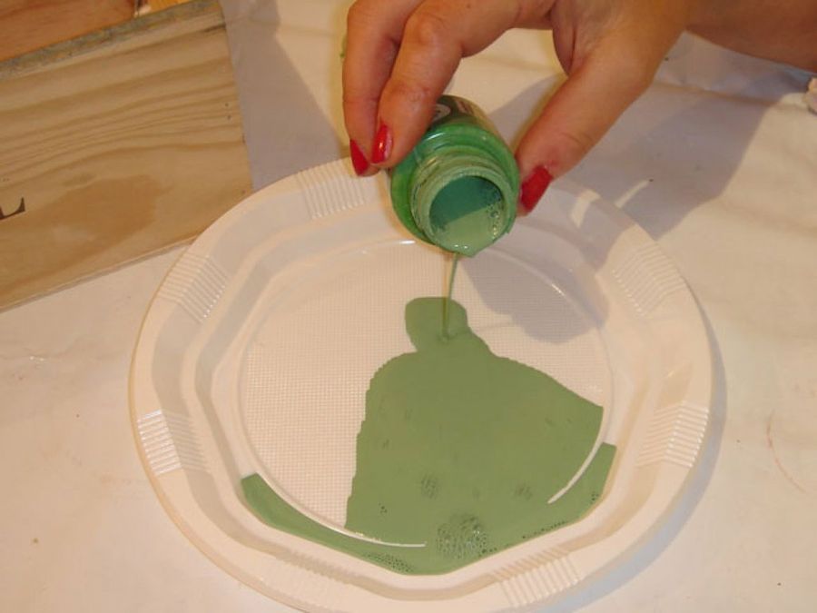 Hemos decidido empezar con una base de color verde. Empleamos una pintura al agua de manualidades, que podemos rebajar con más agua si deseamos un tono más claro. Los platos desechables son muy cómodos para estos trabajos.