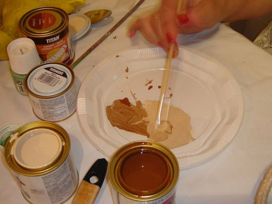 Nuestro objetivo es que la base una vez coloreada permita seguir apreciando los nudos y las vetas de la madera, de ahí el producto escogido.