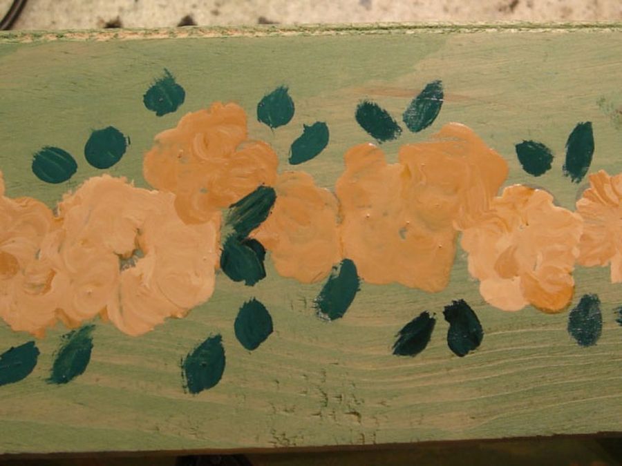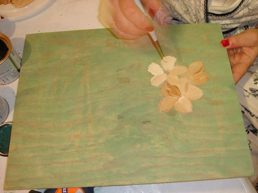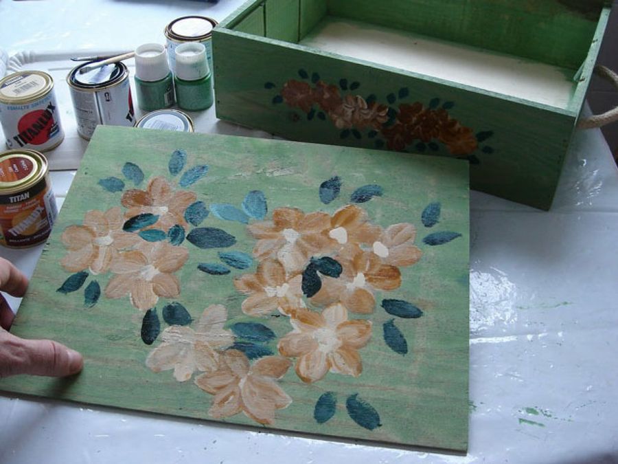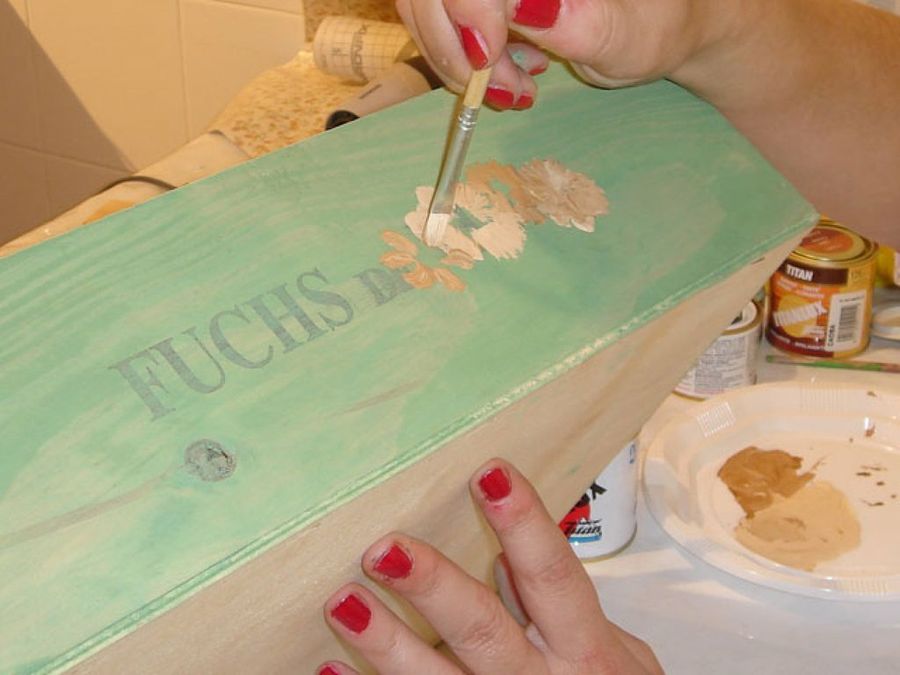 Siempre conviene controlar el pulso cuando pintamos. La pintura verde ya está seca, de modo que la artista utiliza la propia caja para apoyar la muñeca ?y así, pétalo a pétalo hemos conseguido enmascarar el rótulo sin ninguna dificultad. Ahora completamos el motivo con hojas de color verde oscuro, a juego con el tono que hemos dado a la caja.