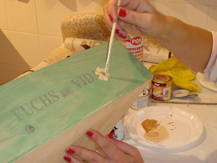 Ahora abordamos ya la decoración de la caja. Para ello empleamos esmalte sintético normal, pintura que sí cubre totalmente la superficie donde se aplique.