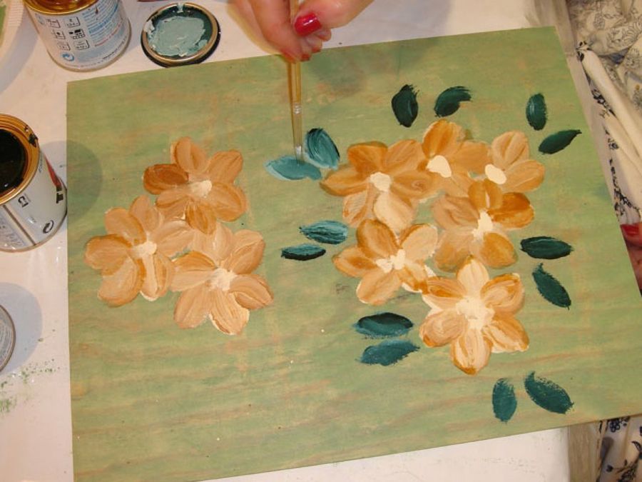 La tapa llevará los mismos diseños de flores. Dado que la superficie es mayor, ahora las hacemos un poco más grandes, ganando comodidad. Primero pintamos la corola en el tono más luminoso? Y a continuación la cubrimos con los pétalos. Conseguiremos hacer el típico relieve jugando con las pinceladas, mezclando diversos tonos de color.