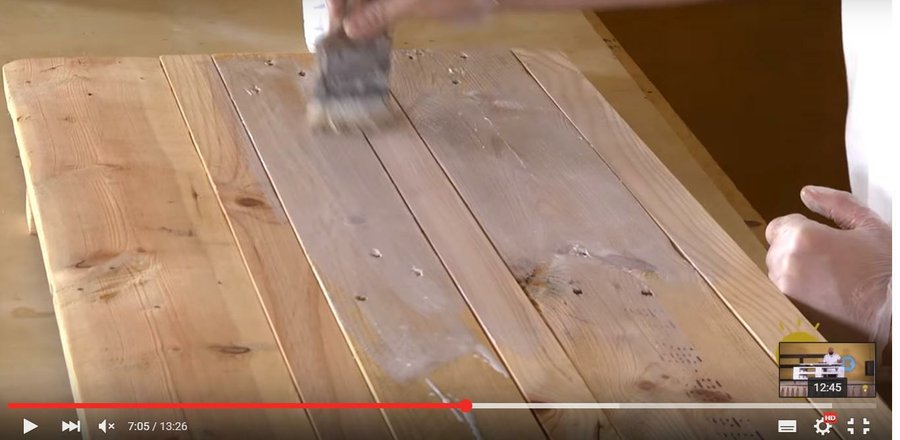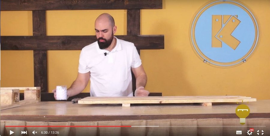 5. Después trateremos con fungicida e insectida toda la madera y pintaremos ambos palets y el tablero de nuestra mesa. Nosotros hemos utlizado un tinte blanco para que se vea la veta de la madera.