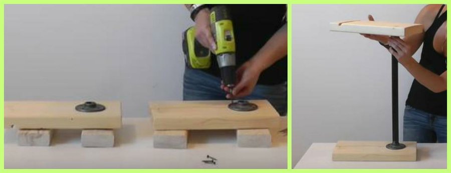 A continuación lija las piezas y aplica una capa de barniz con un paño de tela. Atornilla los soportes de tubería bien centrados en ambas piezas. Por último fija las dos piezas con la tubería formando una 'Z'.