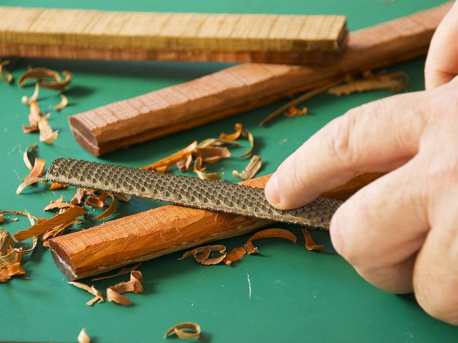 Proseguimos dando forma al utensilio con las lijas. Utilizamos una gama muy completa, empezando por el grano 50, después el 100, luego el 220, para completar la primera fase con el papel de número 400. Es preferible actuar con prudencia, sin eliminar madera en exceso, por lo que después del primer pulido volvemos a desbastar con las limas, y repetimos el lijado. Con la práctica, esto nos lleva poco tiempo.