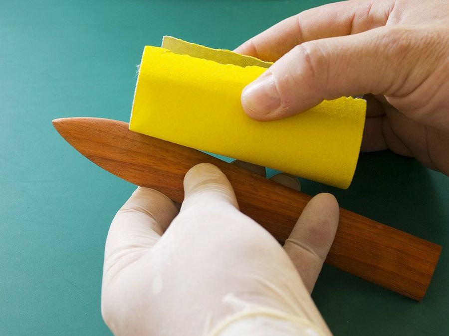 Después de hacer la punta, reanudamos el lijado, ya sólo con papeles de grano 400 y superiores, hasta pulimentar bien toda la superficie y afilar la punta. Esta fase del trabajo la haremos con guantes de vinilo o de látex, para no manchar la madera con el inevitable sudor.