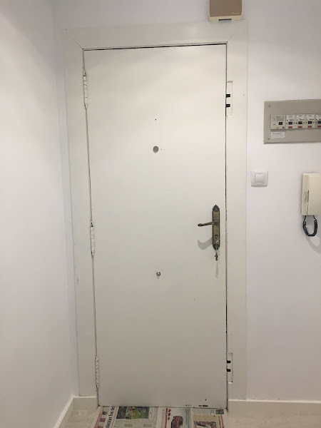 ¡Trabajo finalizado! Nuestro amigo, después de tantear la colocación de la puerta con las tablas en sentido paralelo y horizontal, se decide por la segunda opción, suavizando el contraste con las líneas dominantes de los marcos interiores.