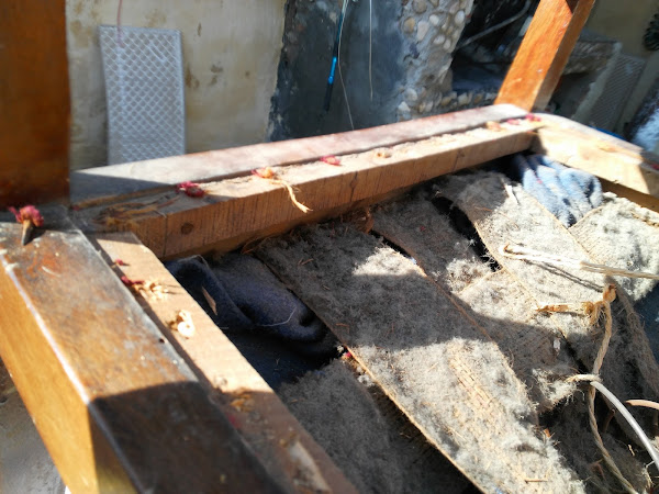 La 1ª fase comenzó dejándola 15 días con el tratamiento antipolillas y pasado ese tiempo quitando todo el tapizado, las grapas, clavos, cinchas, muelles, estopa,etc.