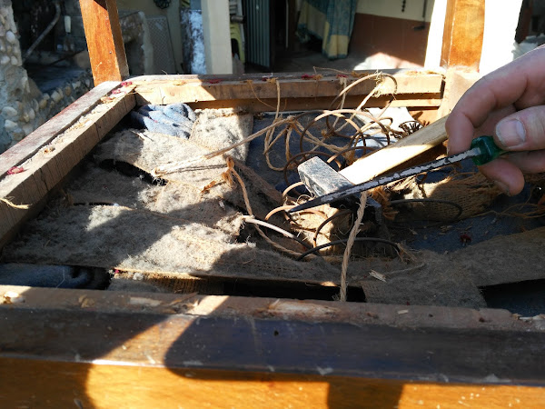 Al darle la vuelta, ví como estaba por debajo. Los muelles sueltos, la tela ,las cinchas y la estopa destrozados, en fin... un drama