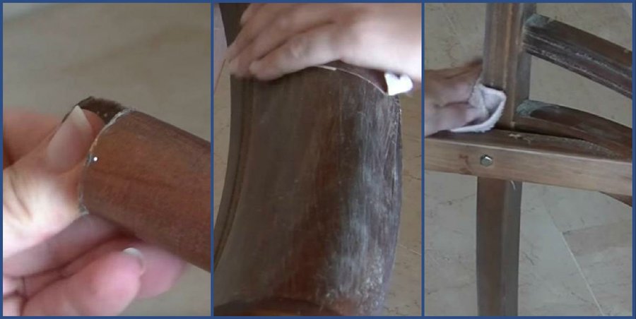 Empieza por preparar las sillas. Quita las tapas de las patas, el respaldo y el asiento. Lija y retira el polvo de madera con un paño húmedo.