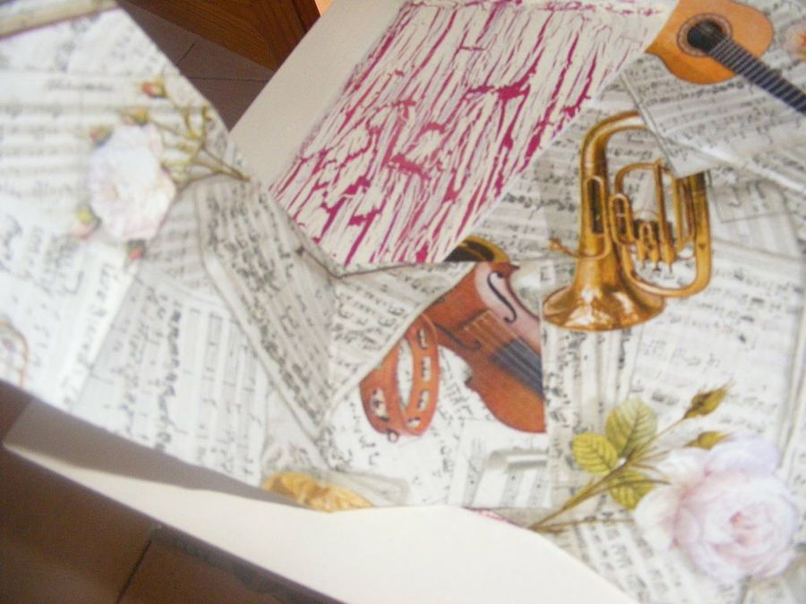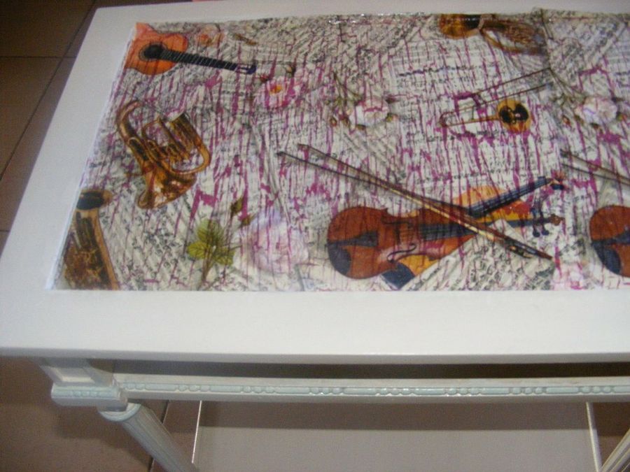 “La música es una de las cosas más importantes de mi vida”, afirma Chilenita, por eso escogió el tema musical para el adorno en decoupage. El procedimiento consiste en aplicar el barniz adherente por debajo de la lámina, y luego sobre la lámina.