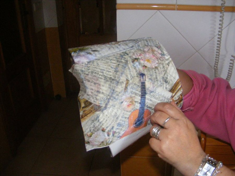 “Y sigo ahora con la lámpara. La pantalla es de papel grueso de color blanco, doy pegamento a toda la pantalla, y el decoupage igual que la mesita”.