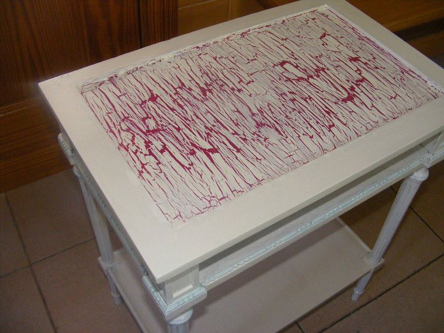 El adorno de la parte superior comienza por una pintura de intenso color rosa, que después se cubre con el craquelador. Dejamos pasar unas horas y pintamos encima toda la superficie de color marfil. Cuando la pintura está seca, extendemos el pegamento para decoupage y colocamos el papel elegido.