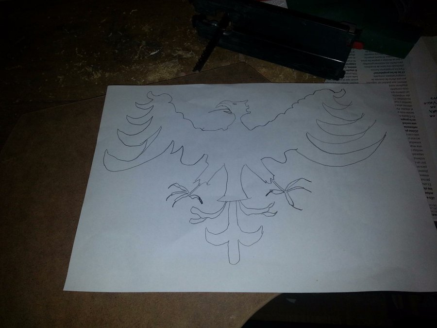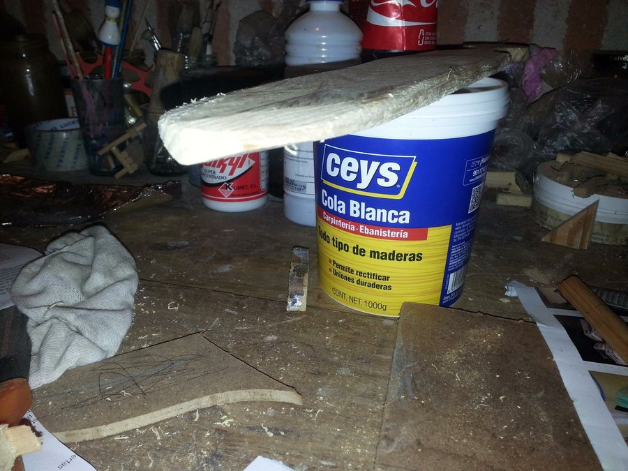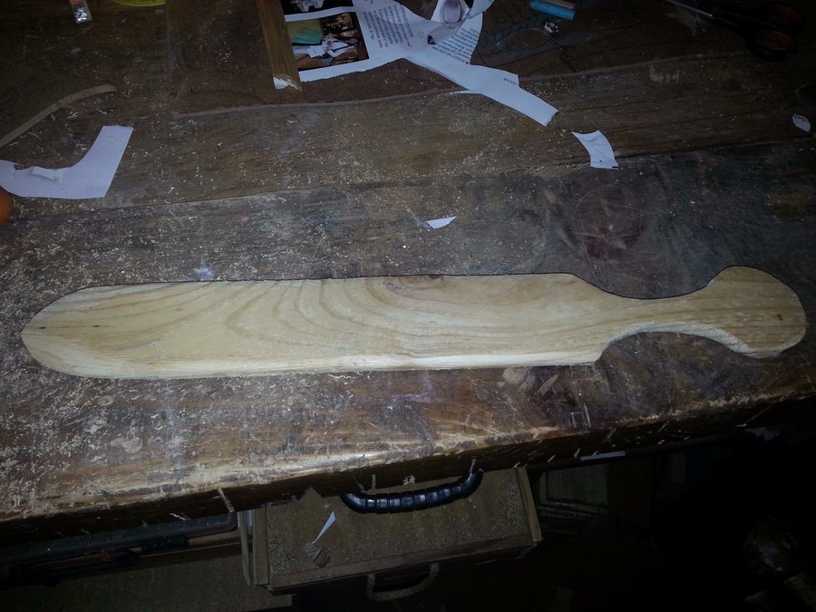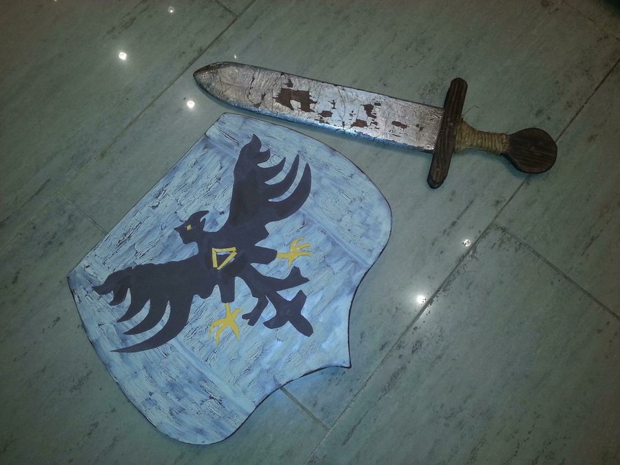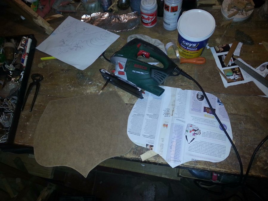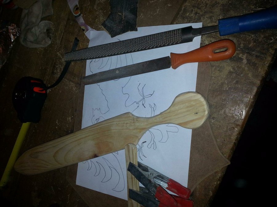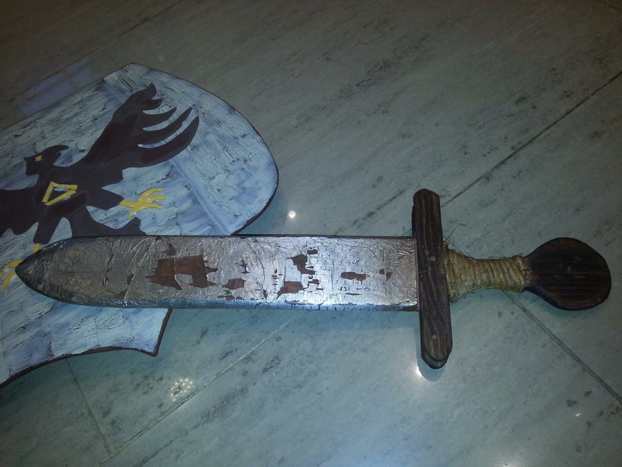 Siguiendo con el tema de reciclar, con una simple tabla de palet, dibujo el contorno de lo que sera la espada y lo corto con la sierra de calar. Una vez cortada, con la escofina de madera y de metal voy dando forma y redondeando los contornos. https://estag.fimagenes.com/cst/images/px.gifSaco el patrón en papel de lo que sera el escudo, y utilizo madera dm de 8 mm. Dibujo a mano alzada un aguila para decorar el escudo. La madera de la espada la lijo, hasta que queda un tacto de lo mas suave. En esta foto se aprecia como dejo la punta y los contornos, ademas de dar forma queda un tacto, muy fino.