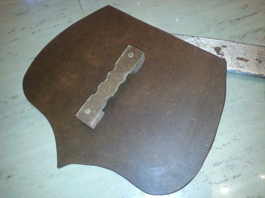 La escofina azul es de madera y la naranja es para metal. El tema craquelado, no me salío como debía. La espada la tiño con nogalina y lo que es la parte del filo la pego papel de aluminio. (del utilizado en la cocina). Cuando esta seco le froto con lana de acero, haciendo asi zonas desgastadas. La empuñadura del escudo, utilizo a misma madera de dm que el escudo y le doy forma. A la empuñadura de la espada la pongo cuerda de esparto.
