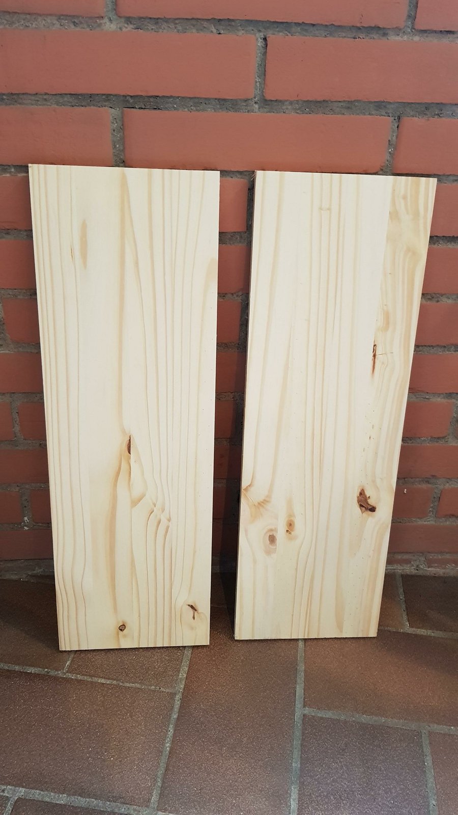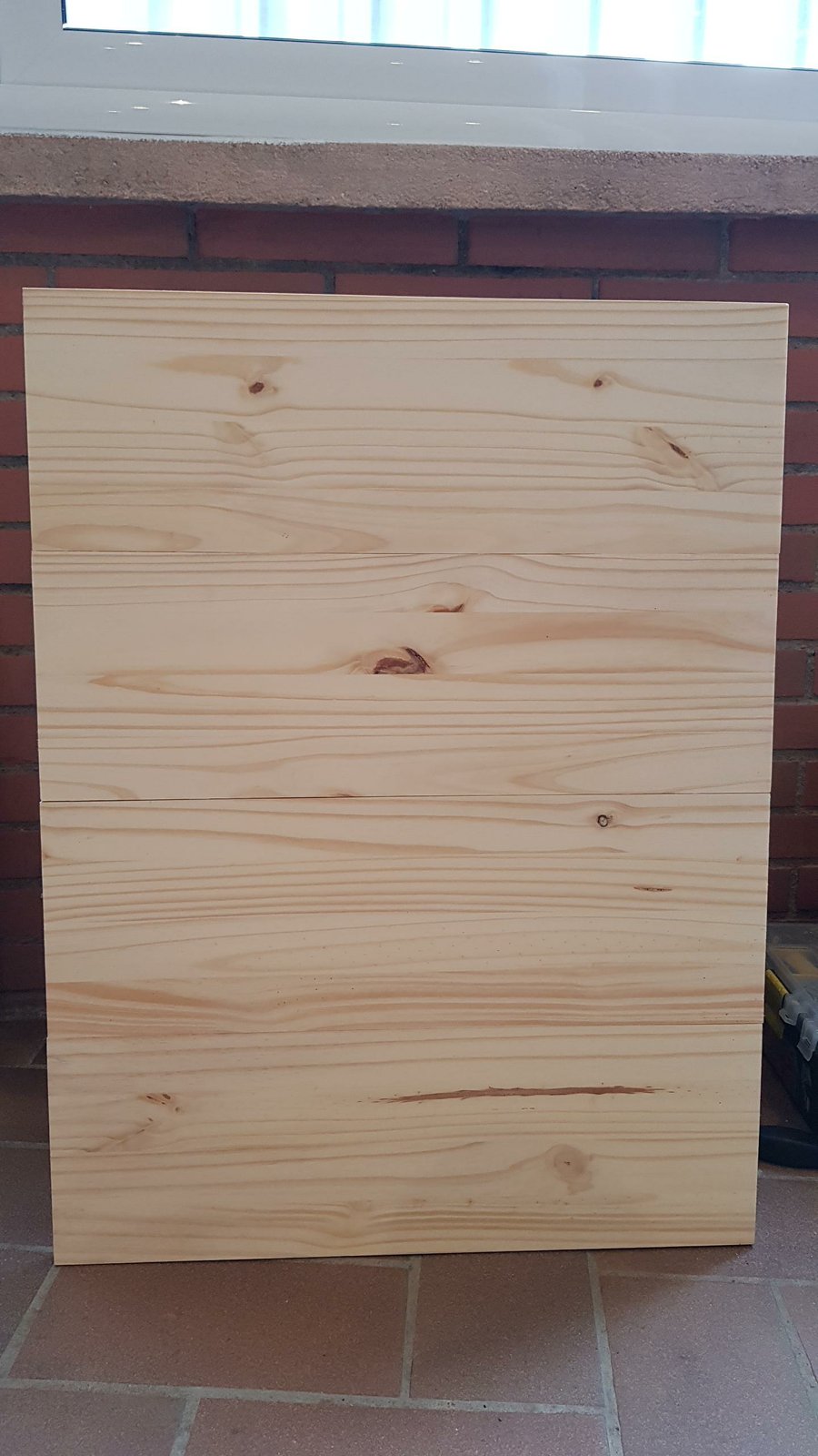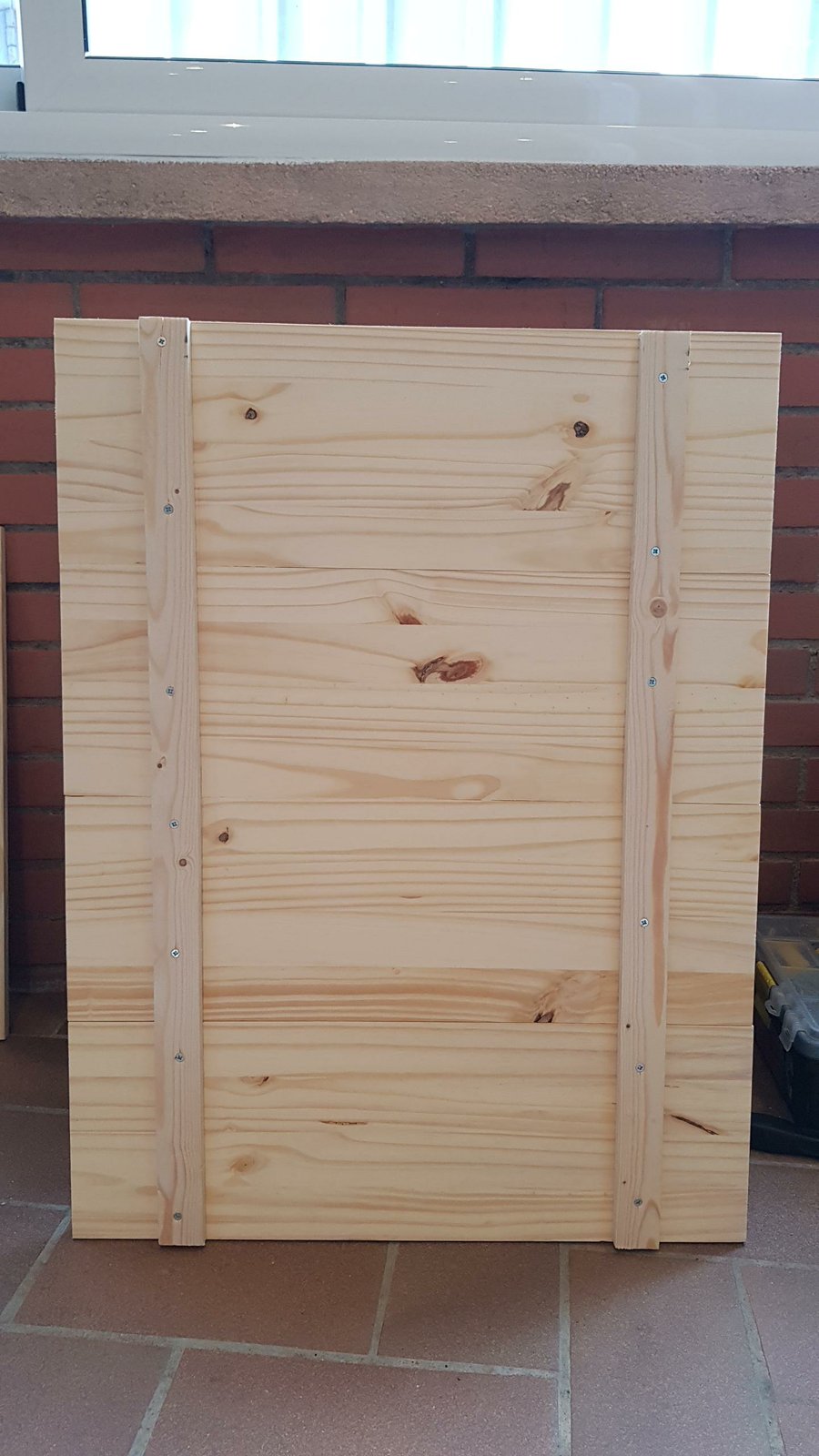 Para el tablero tenéis muchas opciones y medidas. Yo me decanté por comprar un tablero de pino macizo de 2000x400 mm en una gran superfície, me lo cortaton en trozos de 600x200 mm, y usando 4 trozos conseguí un tablero de 80x60cm. El corte y el ensamblado de las tablas es a lo “ancho”, ya que me gustaba más como quedaba la veta de la madera a lo ancho de la mesa. Para unir las tablas usé unos listones con unos tirafondos atornillados a cada tablilla: