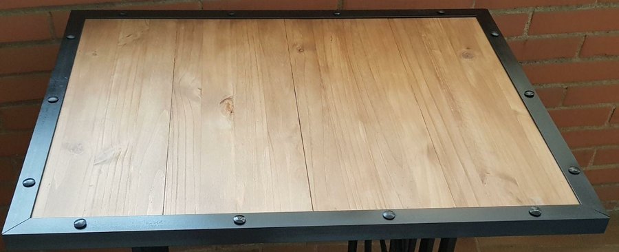 Con el paso anterior ya tendríamos nuestra mesa con patas de máquina de coser y tablero acabado, pero decidí darle un toque “estilo industrial” poniendo un ángulo de acero por el perímetro del tablero. En concreto, el ángulo de acero que he usado es uno en forma de L de 30x30x3.6mm (anchura, profundidad, espesor). Compré una barra de 3 metros de largo y la corté a inglete (ángulo de 45º rematar bien las esquinas) en 2 trozos de 60cm y otros 2 de 80cm de largo, para así cubrir todo el perímetro del tablero (ACLARACION: mejor darle un par de milímetros de margen a la largura para que se solapen bien en las esquinas).