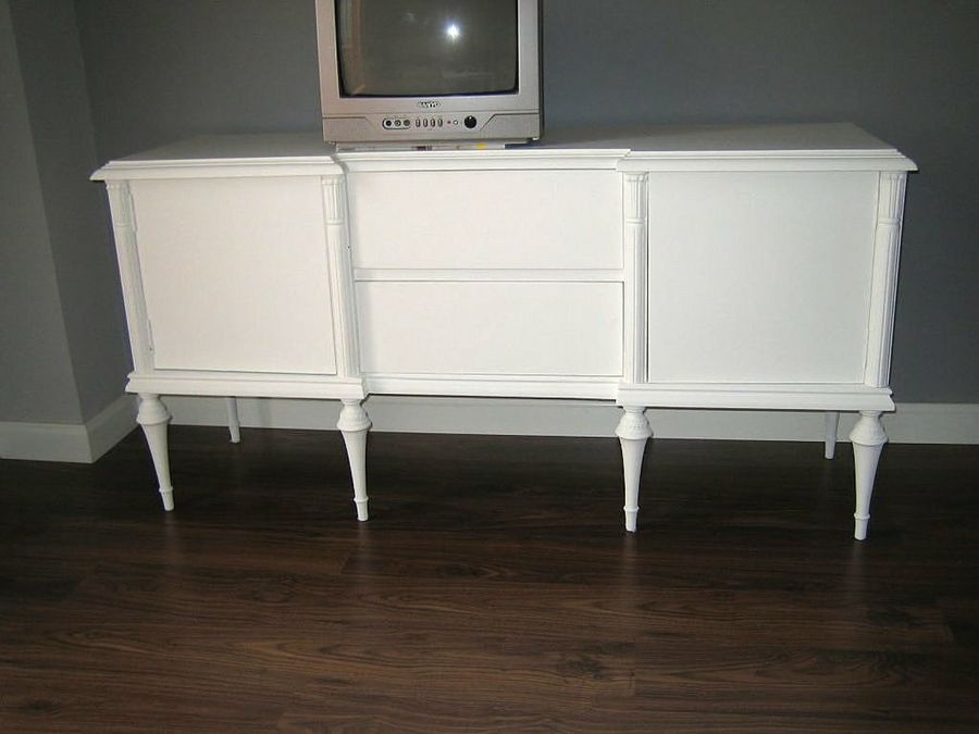 Aguazul descubrió un mueble arrumbado en el garaje de sus padres, con un enchapado bastante feo por cierto en la chapa. Nuestra lectora supo ver la belleza de sus líneas, y así de bien quedó tras un lacado a pistola. Un mueble para la televisión de aire versallesco.