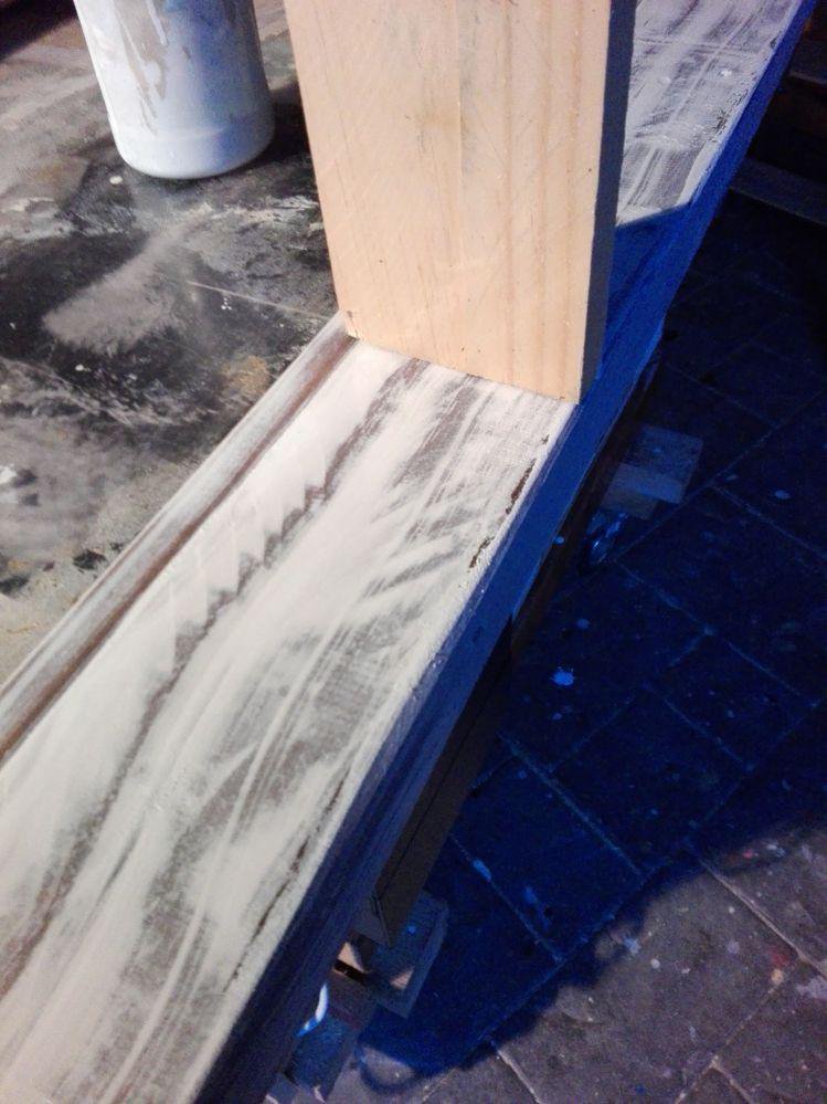 - Una vez seca esta mano lo volveremos a pintar esta vez de blanco. Esta mano de pintura la daremos esparciendo la pintura con una espátula o similar, respetaremos las imperfecciones de la madera que esto aportan carácter al resultado final.
