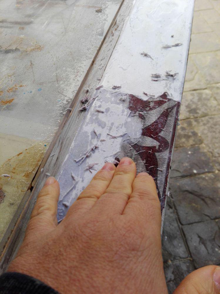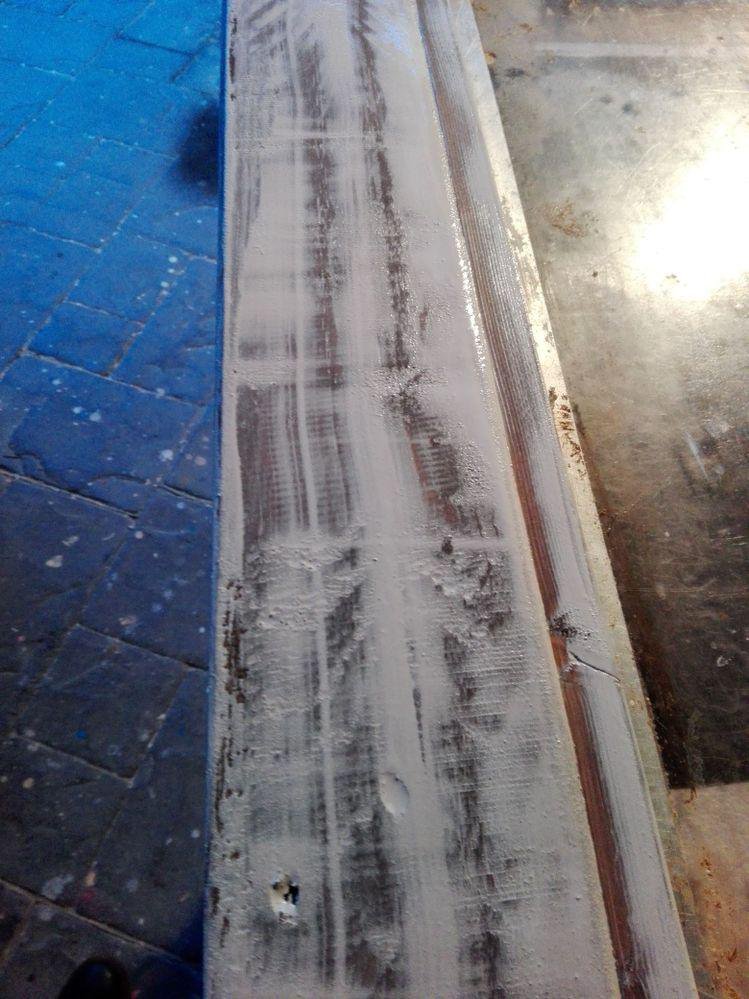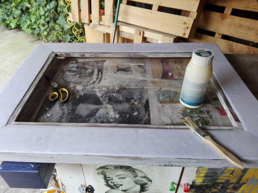 - Empezamos a trabajar el espejo dando un decapante en la parte trasera y seguiremos con agufuerte de una forma desigual hasta que apreciemos transparencia en la zona donde hemos aplicado el producto.