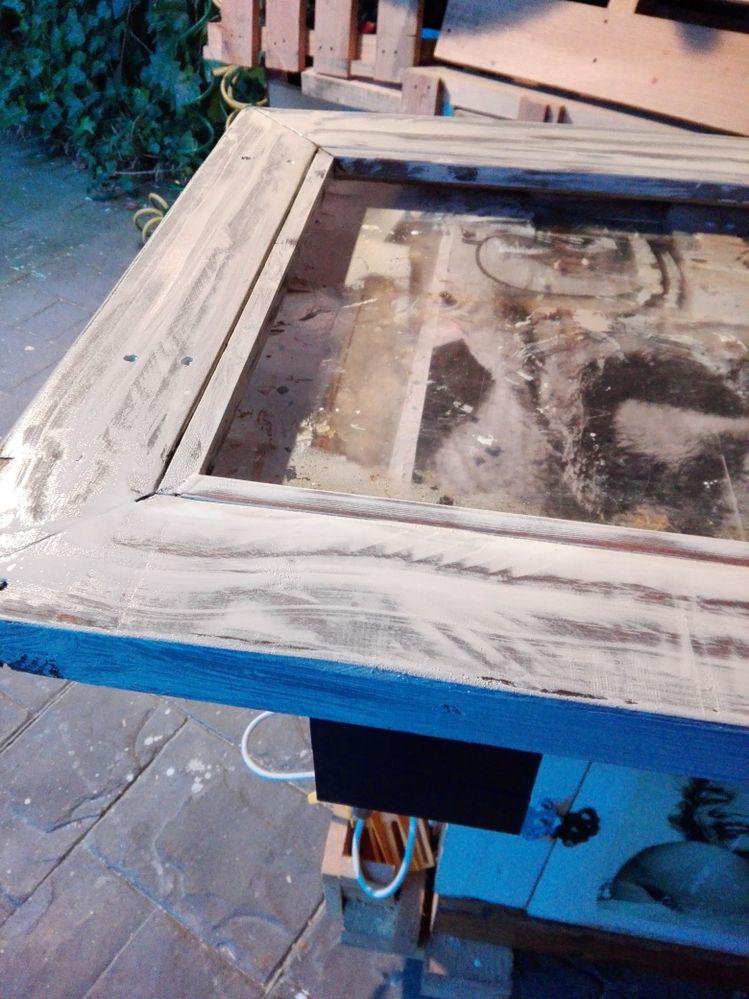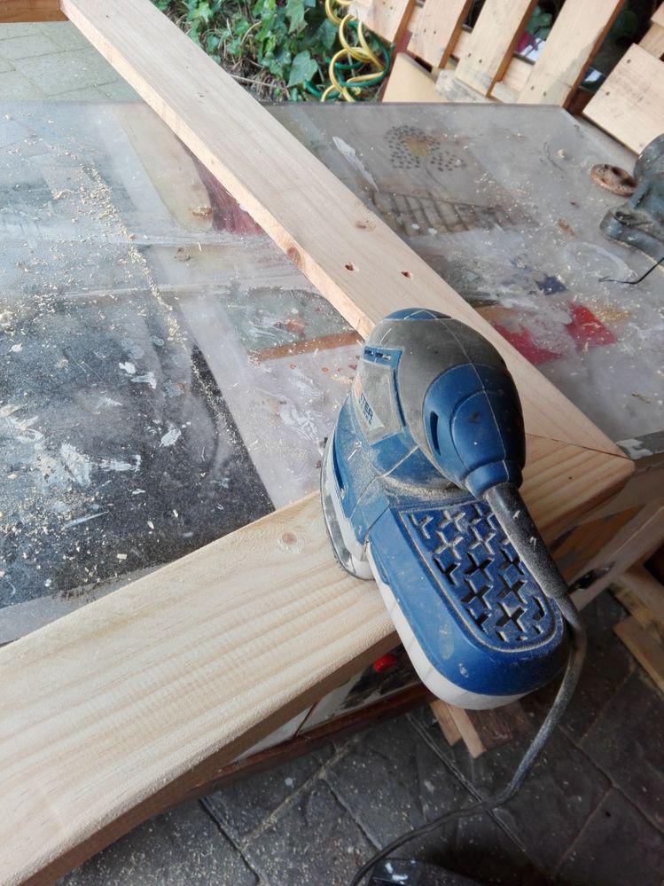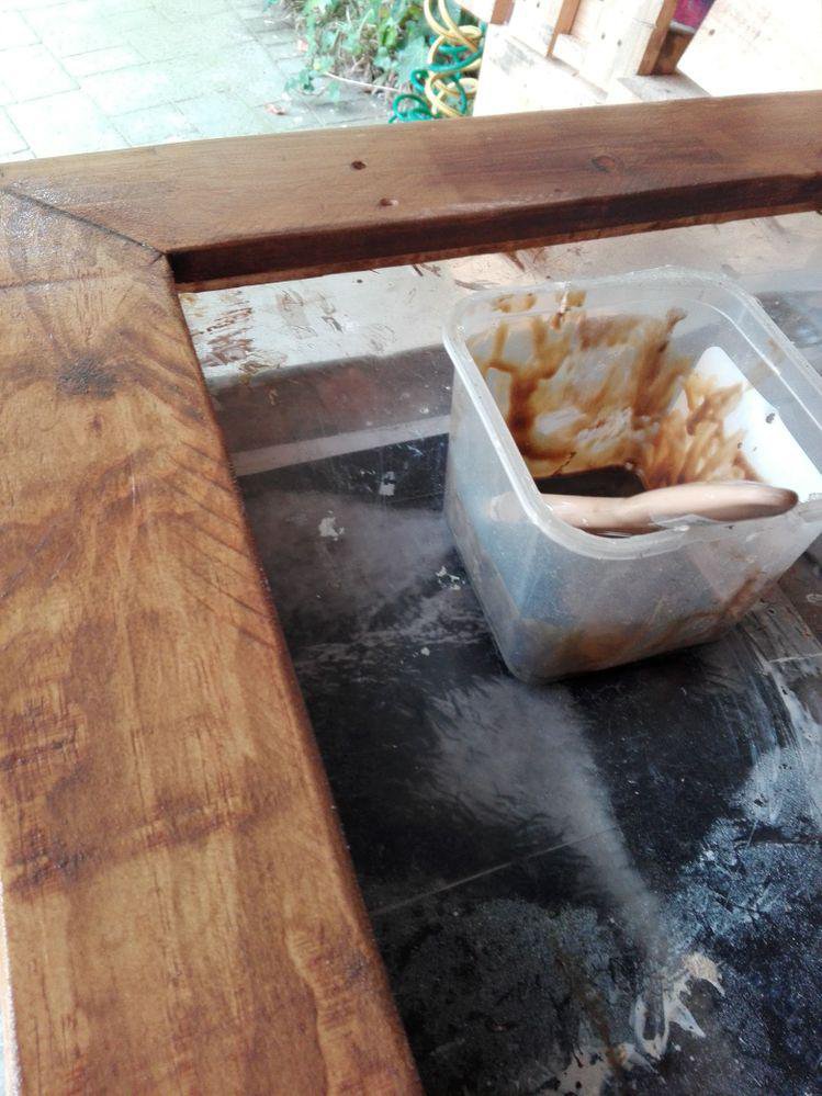 - Tras lijarlo a conciencia le damos la primera mano de tinte para envejecer el aspecto de la madera