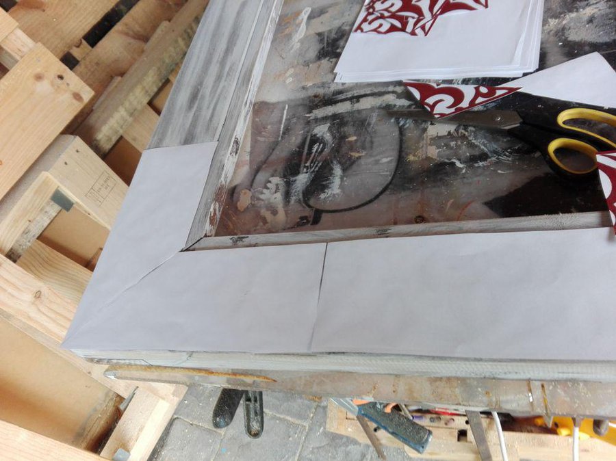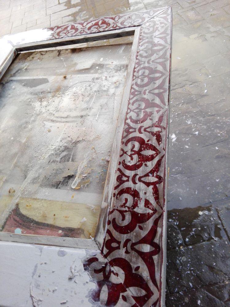 - Una vez dejemos secar al menos un día todo el contorno del marco con sus cenefas, aplicamos agua por zonas y empezamos a levantar la paste de papel y aquí aparece el motivo de la cenefa