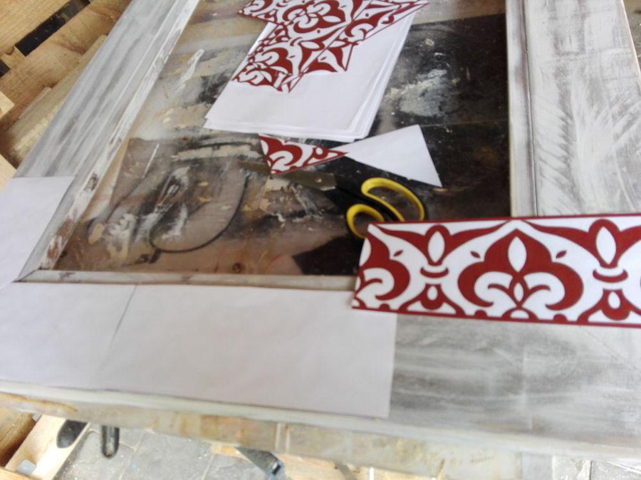 - En el marco aplicaremos unas cenefas que previamente imprimimos en papel y aquí trabajaremos la técnica del transfer.
