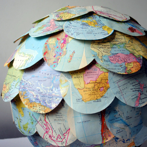 Las lámparas de papel arroz se pueden personalizar de muchas formas, en esta foto lo hacen con mapas, pero en el enlace tenéis más ideas.