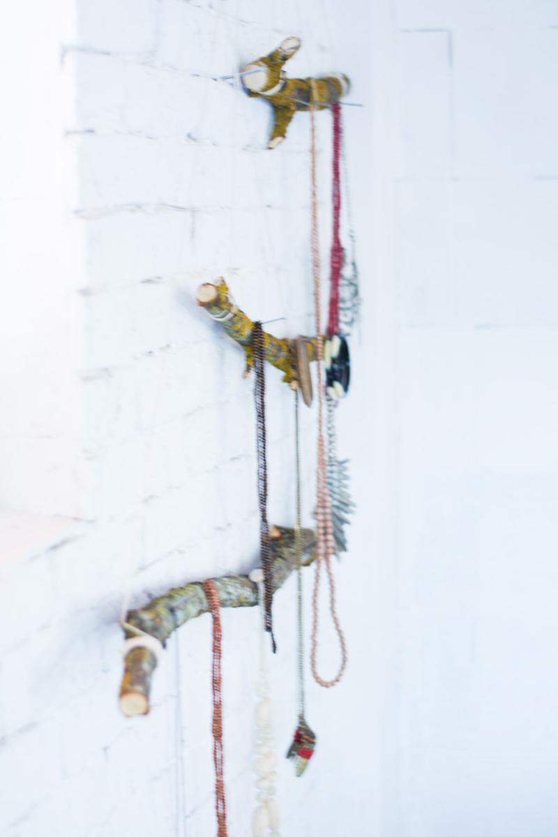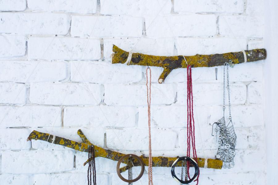Cortamos nuestras ramas de diferentes medidas y vamos clavando una serie de puntas dejando espacios, para colgar las diferentes joyas. Puedes lijar un poco las imperfecciones, pero lo ideal es dejarlas con toque rústico y natural.