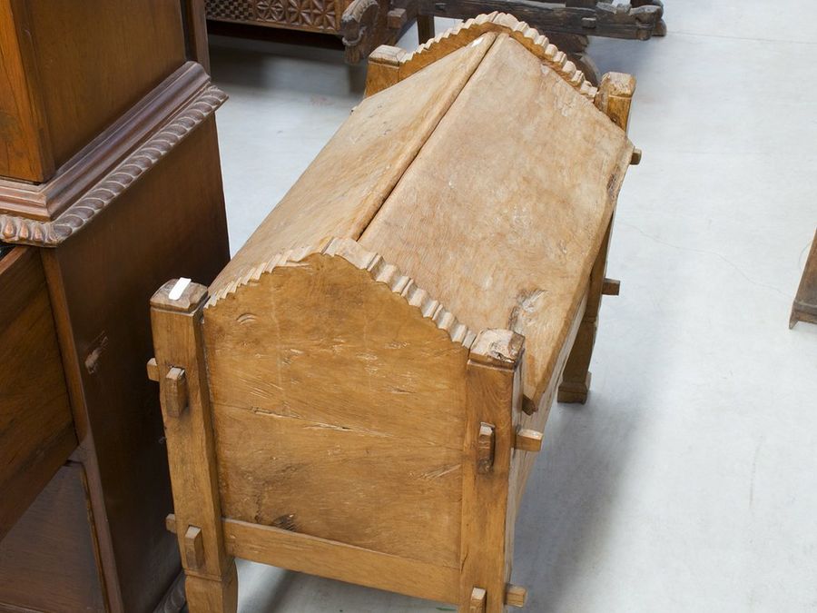 Este sólido cofre se utiliza para guardar enseres y menajes. Nos llaman la atención el macizo grosor y las dimensiones de las tablas utilizadas. Nuevamente se trata de un mueble de teca, que va montado sin fijaciones mediante ensambles pasantes de caja y espiga. Las pesadas tapas abatibles pivotan sobre clavijas de la propia madera, encajadas en los laterales al tiempo de montar el conjunto.
