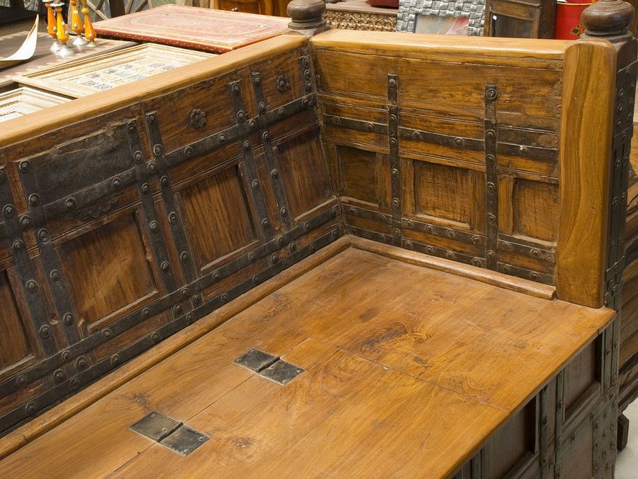 Incluso un pequeño arcón de sobremesa está realizado con tablas macizas de teca. El corte de las piezas es visiblemente artesanal, un atractivo que ha aumentado por el prolongado uso durante largos años.