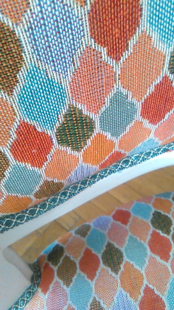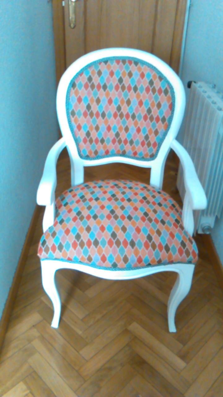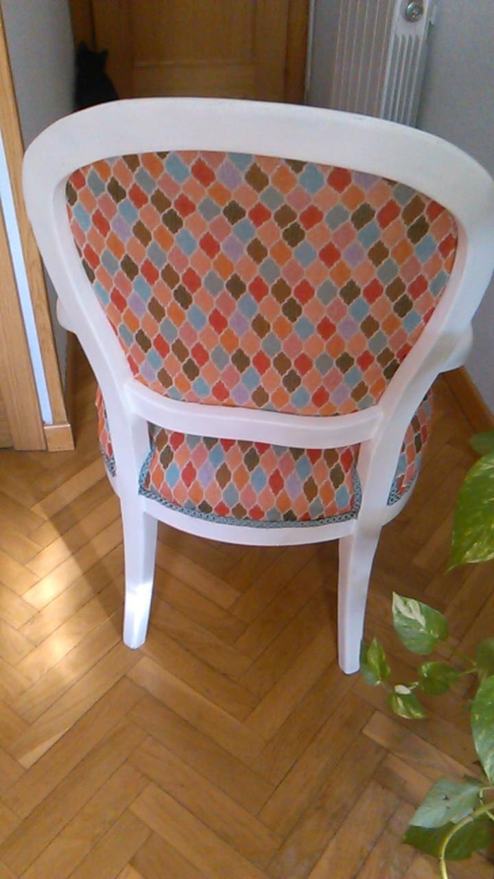 Pinté, blanco antiguo de Chalky Finish Pint Muebles Xylazel, barnicé con un barniz al agua y tapicé con una tela alegre. No toqué la espuma del asiento y el respaldo porque estaba en perfectas condiciones. La pasamanería la compré en la plaza de Pontejos.
