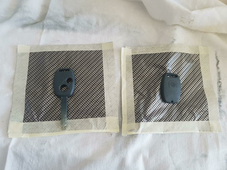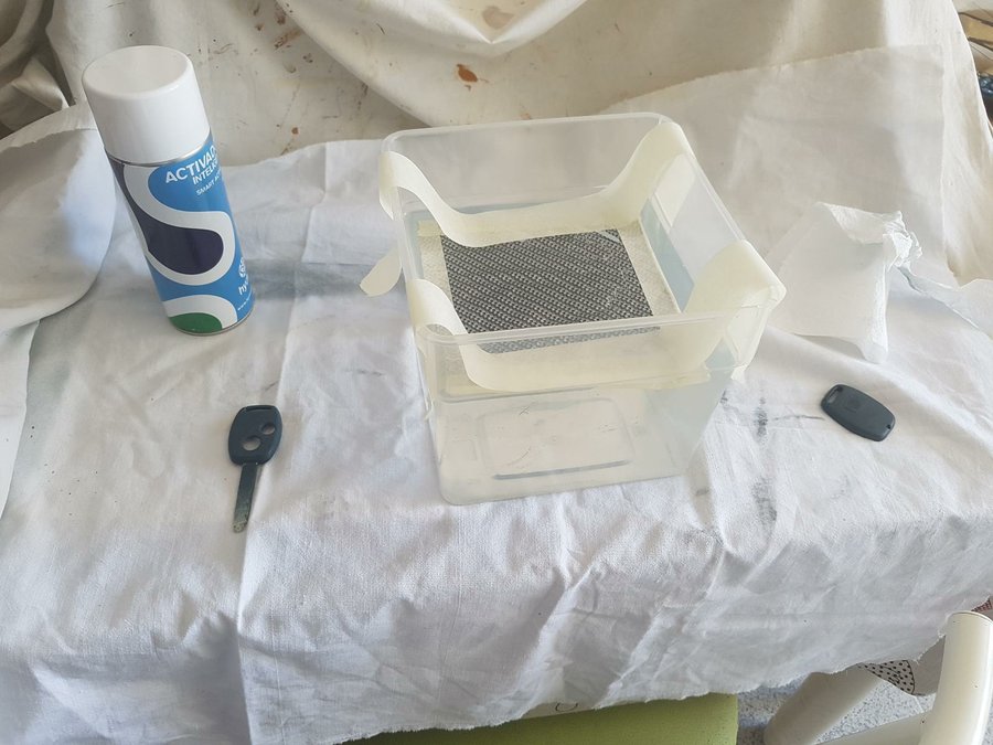 Ahora es el momento de andar ligeros, en el momento en el que la lámina entre en contacto con el agua, empieza la cuenta atrás. Contamos minuto y medio, pondremos dos tiras de cinta pegadas en los extremos de la lámina para que no se mueva y rociamos una fina capa de activador y pasados cinco segundos, introduciremos la carcasa de la llave en un angulo de unos 30 a 45 grados, y la iremos introduciendo muy despacio. Ya sumergida retiraremos con la otra mano el resto de lámina disuelta y la sacamos.