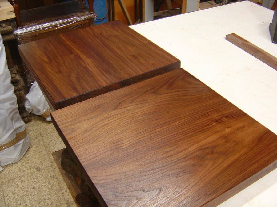 Después de un lijado minucioso, llega por fin el capítulo del acabado. Ahora el nogal revelará toda su cálida belleza.