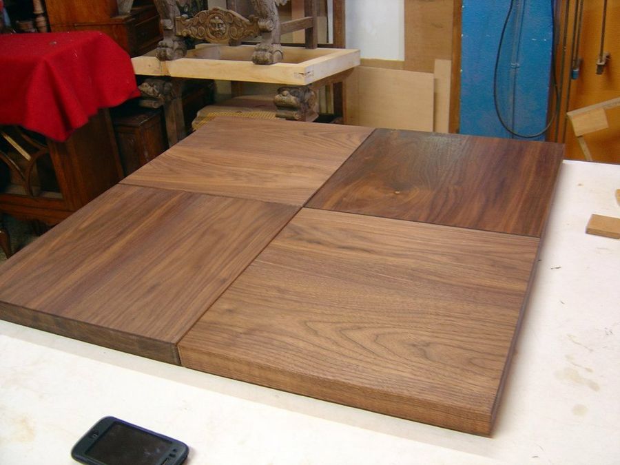 Cortadas las ocho piezas, se pasan por la máquina para dejarlas bien lisas. Afloran las vetas del nogal, tan apreciadas en ebanistería. Es uno de los motivos que hacen de esta madera la preferida de multitud de restauradores, tallistas y carpinteros.