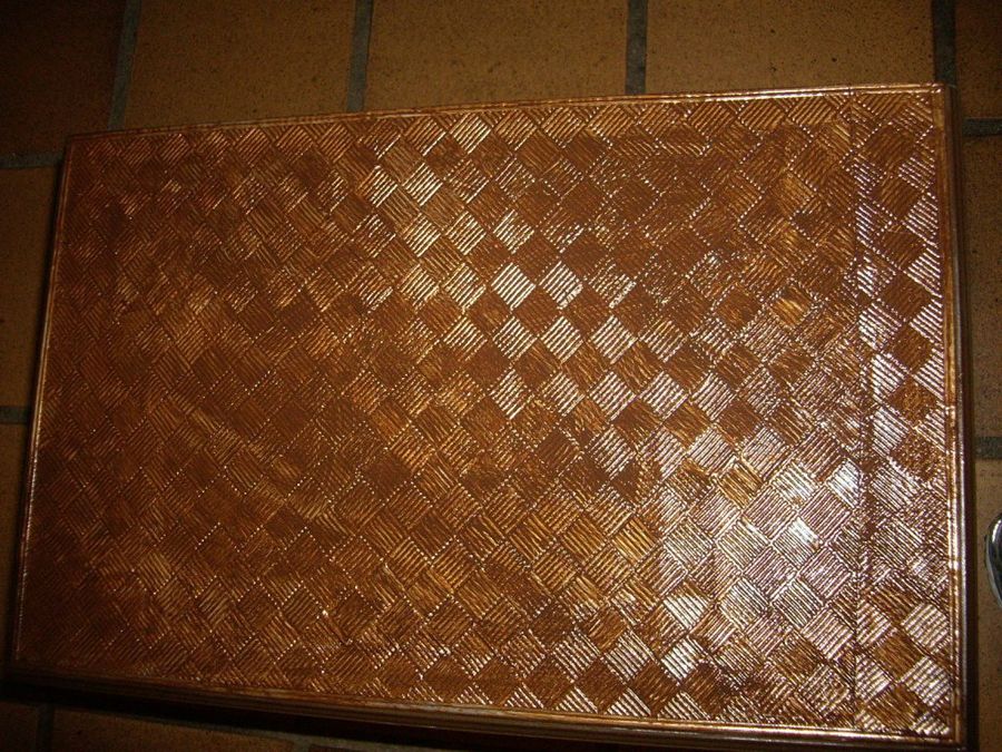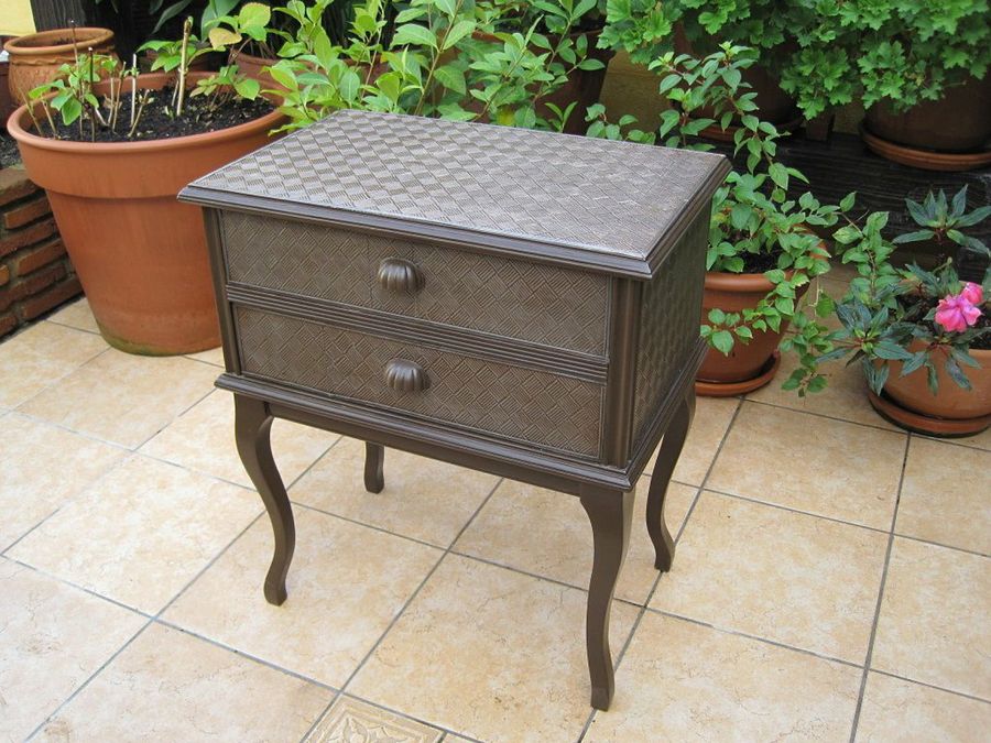 Eva44 cuenta que en un post de Kandika vio unos preciosos cuadros realizados con plantillas de estaño, y “se le encendió la bombilla”. Decidió probar la técnica en una mesita de noche. Después de lijarla, le dio dos manos de gesso en las patas y el marco. Seguidamente aplicó dos manos de pintura color chocolate, y, cuando estuvo seca, una mano de barniz al agua.
