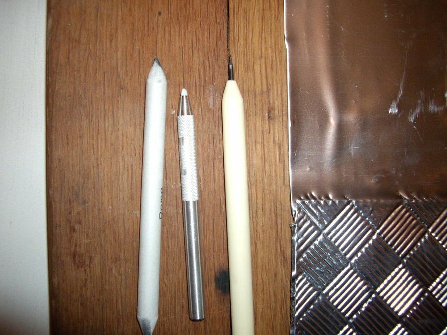 Colocamos el estaño sobre la plantilla, pasamos el difumino para marcarlo, y luego se graba con el buril cada línea del dibujo.