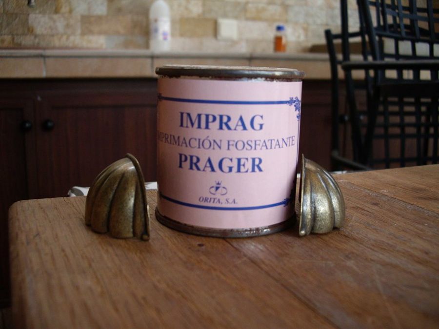 Nuestra lectora había reservado para la mesita unos tiradores de color dorado viejo, antes de saber el tratamiento decorativo que aplicaría al mueble. Para igualar los tiradores, les dio una imprimación fosfatante, y una vez secos los pintó en el mismo color marrón del resto del mueble.