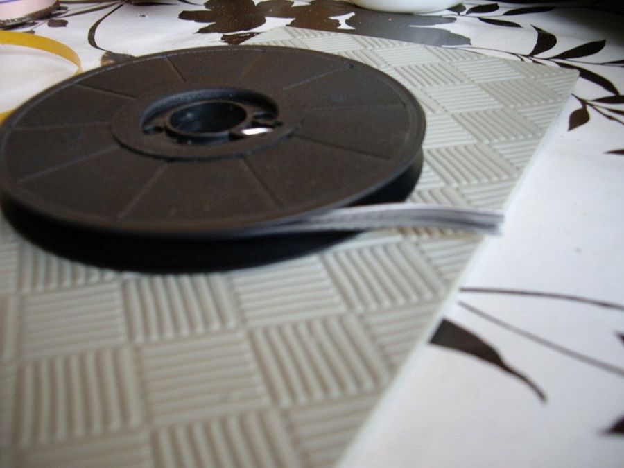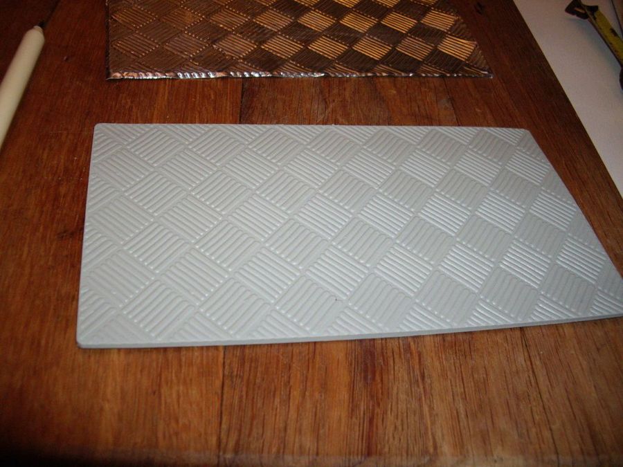 Pegamos el estaño sobre la plantilla, y luego pegamos el conjunto en la superficie del mueble. Se adorna el borde con cinta de estaño.