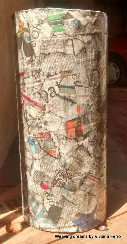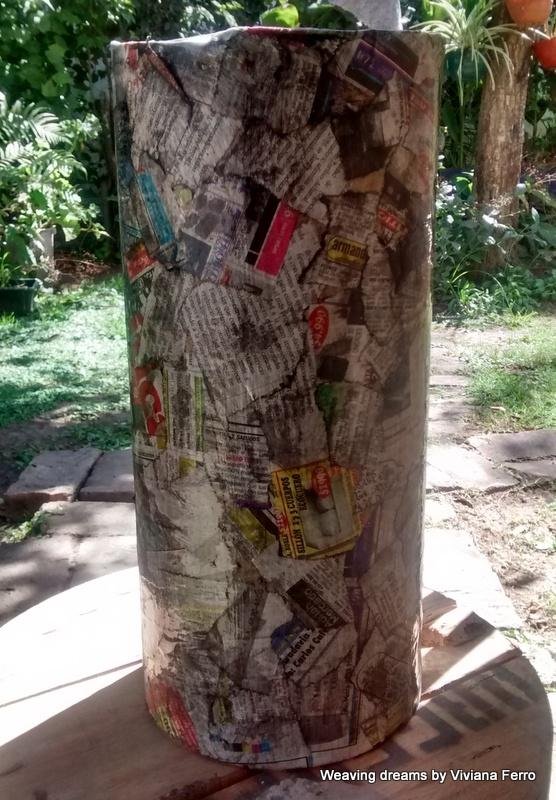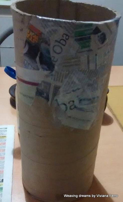 Empecé por recuperar un tubo de cartón grueso, sobre el cual realicé una cartapesta. Para las que no saben cómo se realiza les recomiendo visitar esta página. Verán que se trata de una técnica muy sencilla que, en este caso, me ayudó a fortalecer aún más el cartón.
