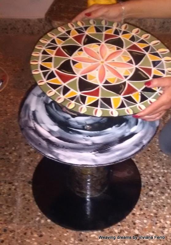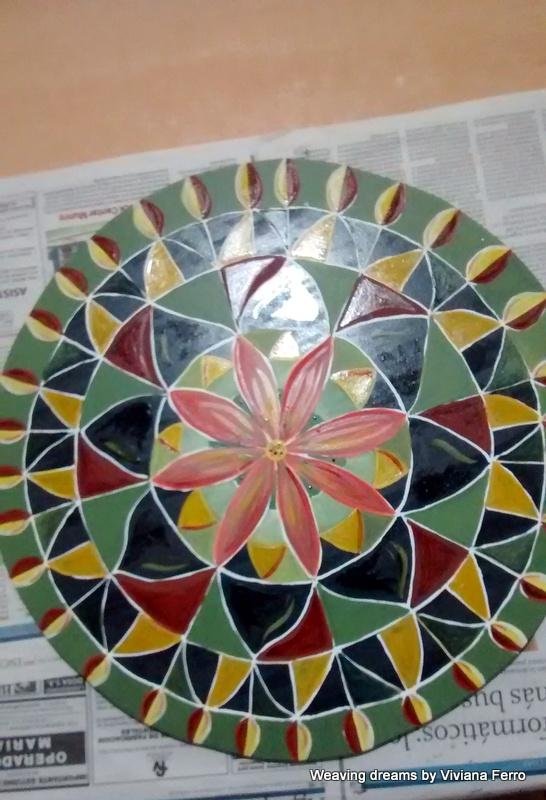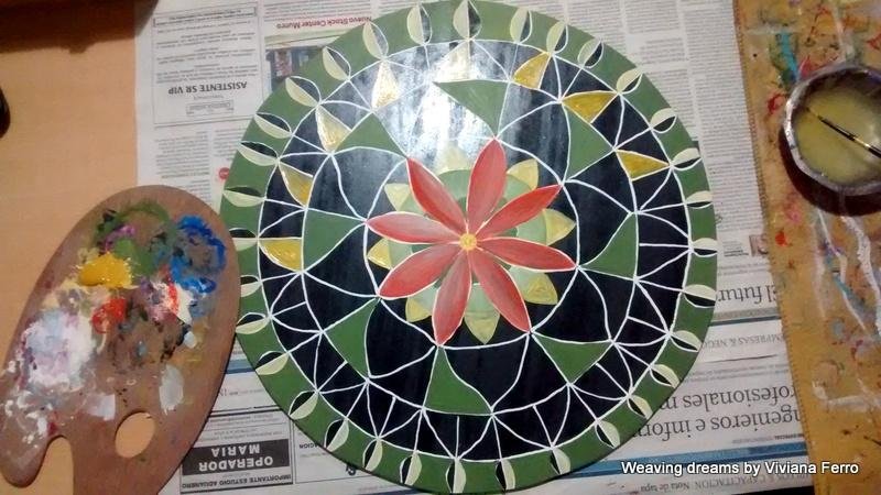 Una vez seca la pintura dibujé el diseño de mi mandala sobre él y comencé a pintar dejando que la imaginación eligiera los colores