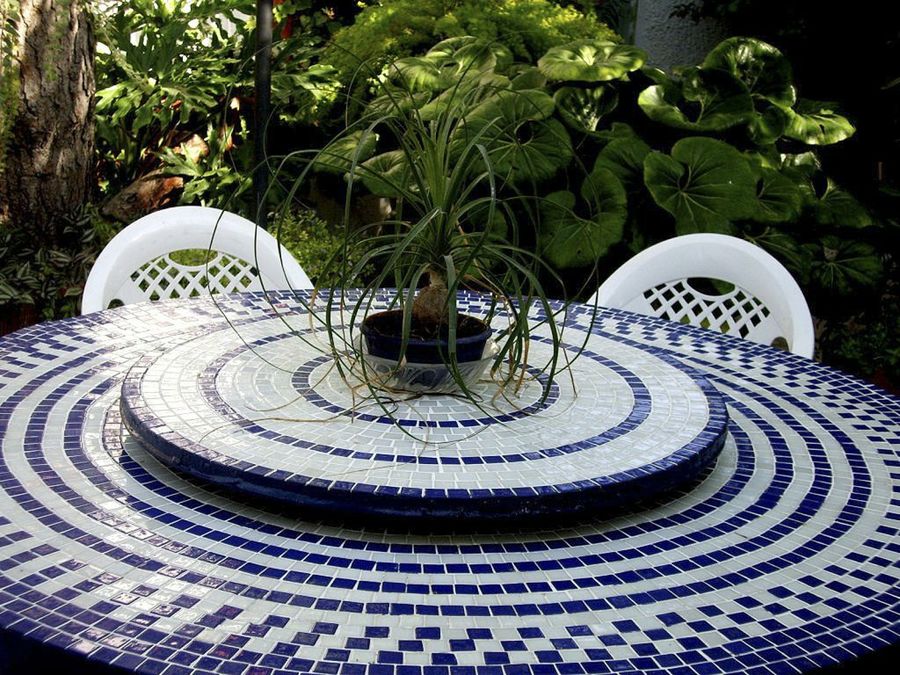 Otra cerámica muy común en baños y piscinas, el gresite, también destaca como adorno para muebles. Y la mejor muestra es la celebrada mesa de Zenaida a partir de una bobina de cable. Para mayor comodidad de los comensales, el elemento central es giratorio.