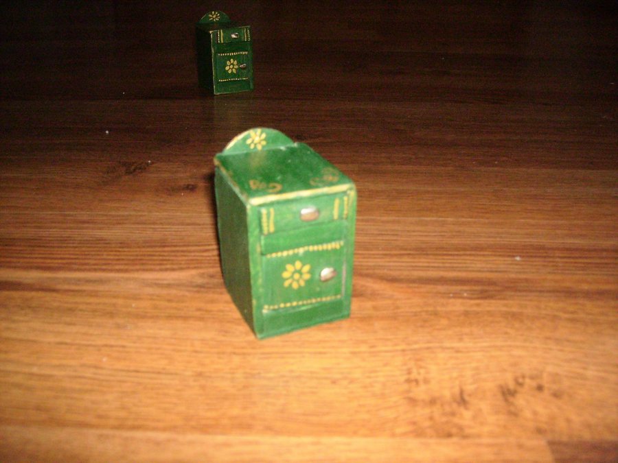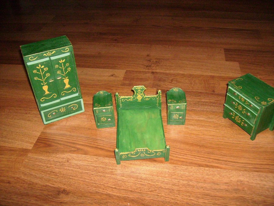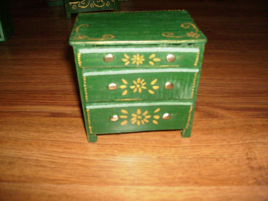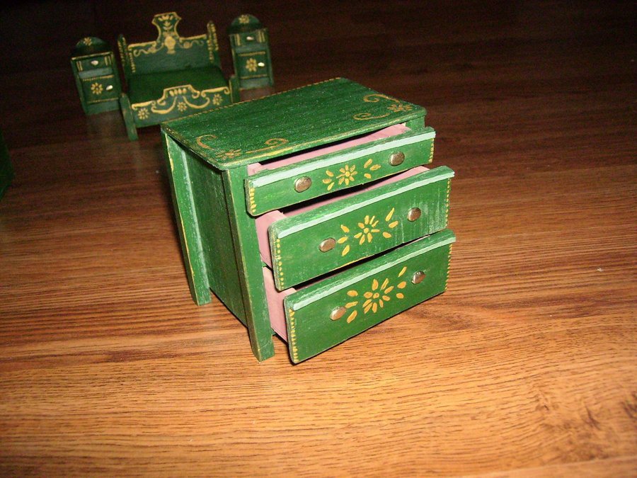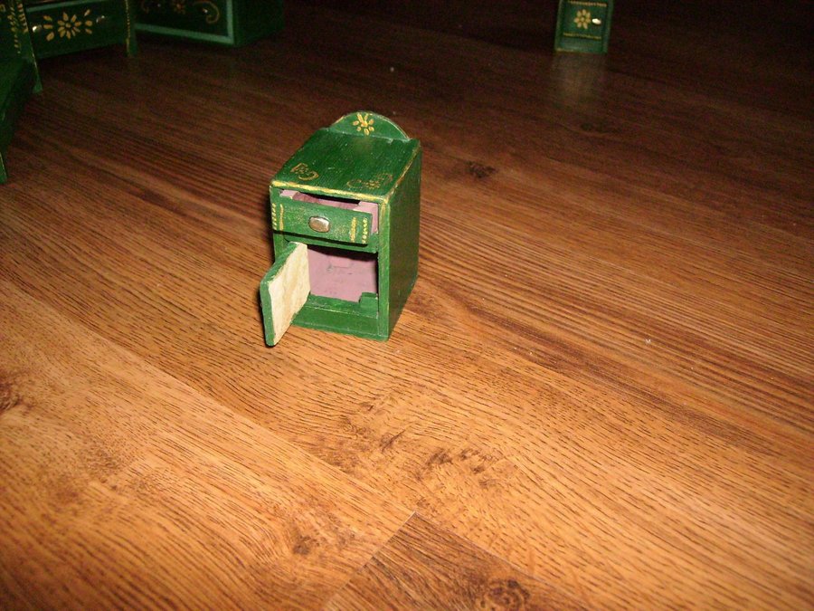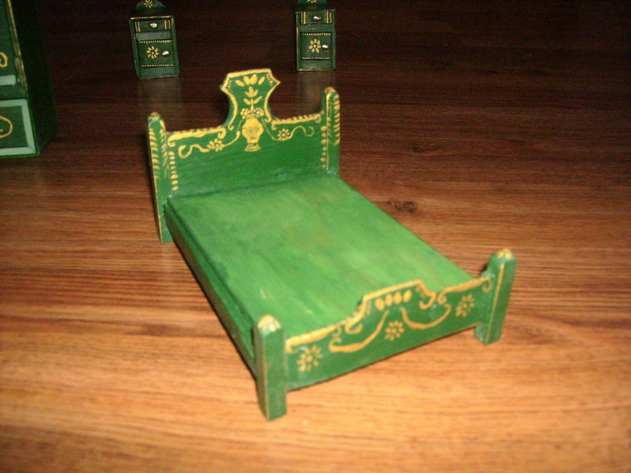 La cama aquí no tiene colchón. Pero cuando la ponga en la casita tendrá su colchón , su juego de sabanas y su colcha. Vista de las mesillas el acabado también es con pintura acrílica verde y detalles en pintura oro a mano alzada. Tanto la puerta como el cajón se abre en ambas mesillas. Vista general de todo el conjunto de dormitorio.