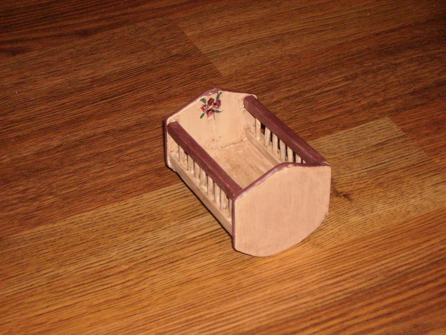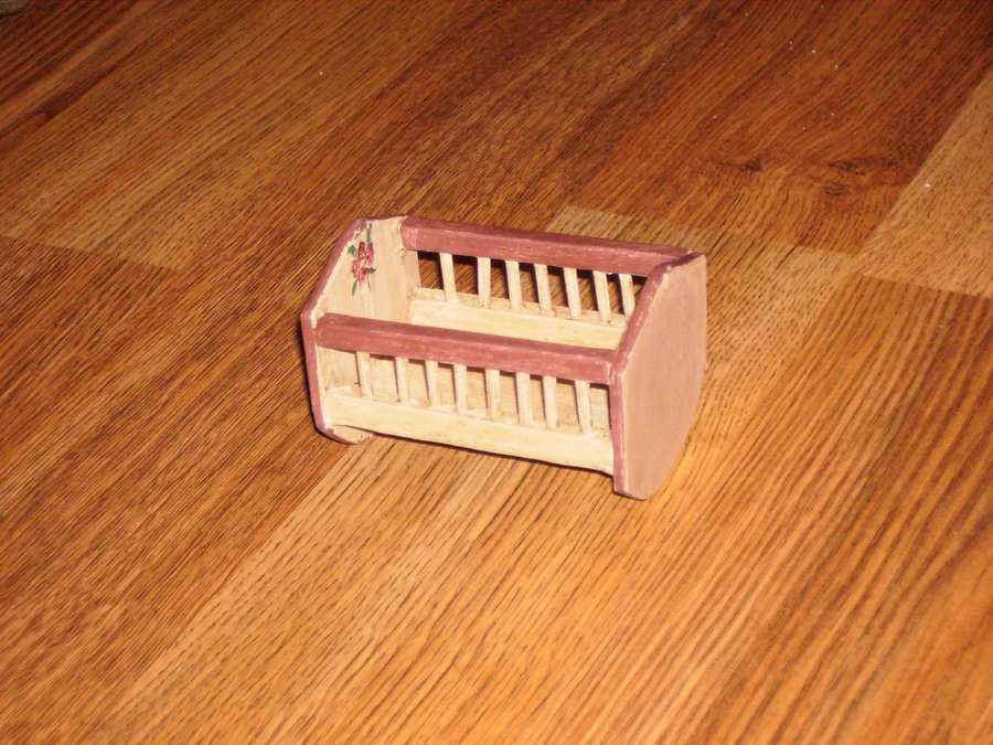 La Campana que irá en la cocina También esta construida en madera y forrada con el ya mencionado cartón de huevos. La cunita del bebe esta hecha toda en madera, los barrotes con la madera de los pinchos morunos. Pìntada con acrílicos. Se puede mecer.