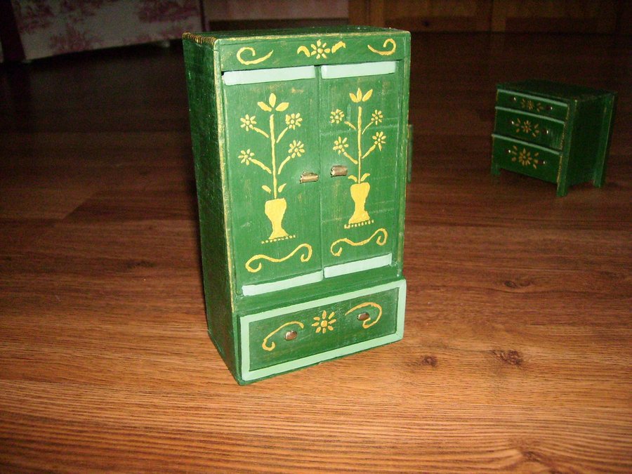 Las puertas y los cajones del mueble de madera miniatura se pueden abrir. El acabado esta teñido con nogalina y terminado con cera. Las zonas coloreadas están pintadas con pinturas acrílicas y un ramo de flores pintado a mano alzada.