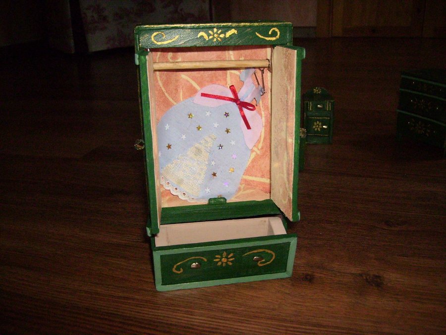 El interior esta forrado con papel de un catalogo de papeles de pared. Tanto las puertas como el cajón se pueden abrir. La cómoda con tres cajones que también se pueden abrir.