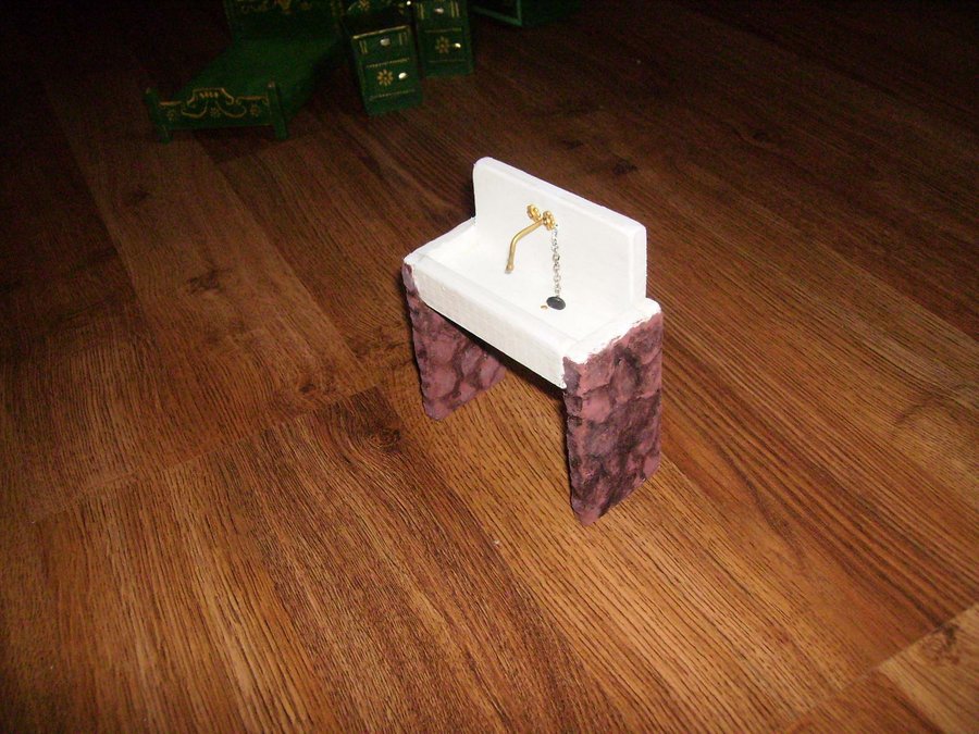 El fregadero hecho en madera y pintado con pintura acrílica blanca, le pongo el grifo que es un clavo doblado y unas cuentas de collar los mando del grifo. El tapón con un trozo de cadena vieja y un poco de pasta de papel el tapón, al que pinto de negro. Los laterales están forrado con trozos de cartón de un paquete de huevos y pintado con pintura acrílica para simular la piedra.