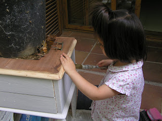 Aquí está desarmada y comenzando a lijar.Tenía pensado hacerla en blanco y dejar los cajones y el sobre en su color natural, por lo que me armé de paciencia y lijé,y lijé hasta que me dí cuenta que no tenía arreglo, es de contrachapado con un barniz horroroso y difícil de quitar